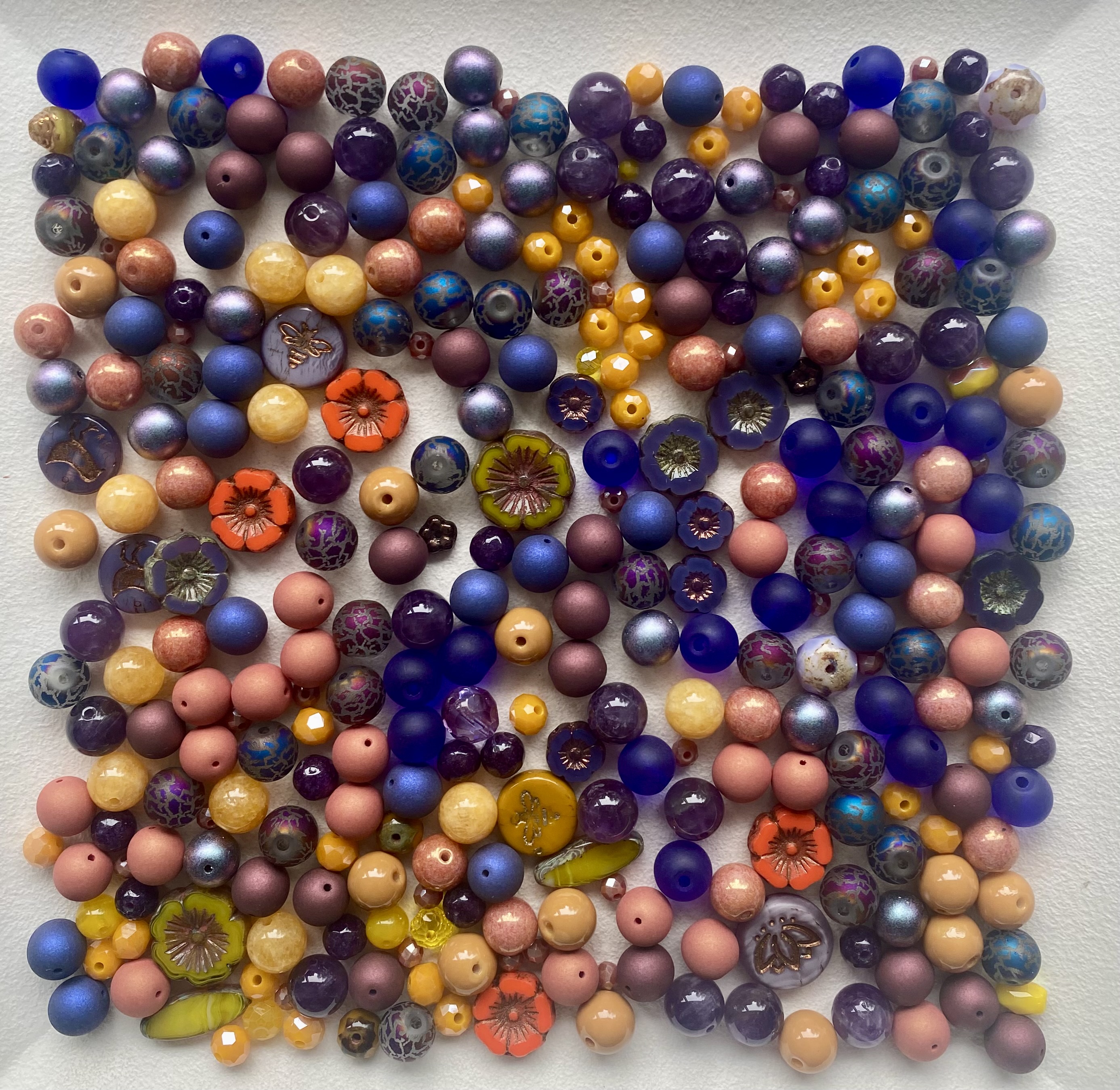 Ce magnifique mélange contient plus de 300 perles en verre de Bohème et pierres naturelles, des fleurs pressées et des perles irisées, parfaites pour composer bracelets, colliers, boucles ou sautoirs uniques.