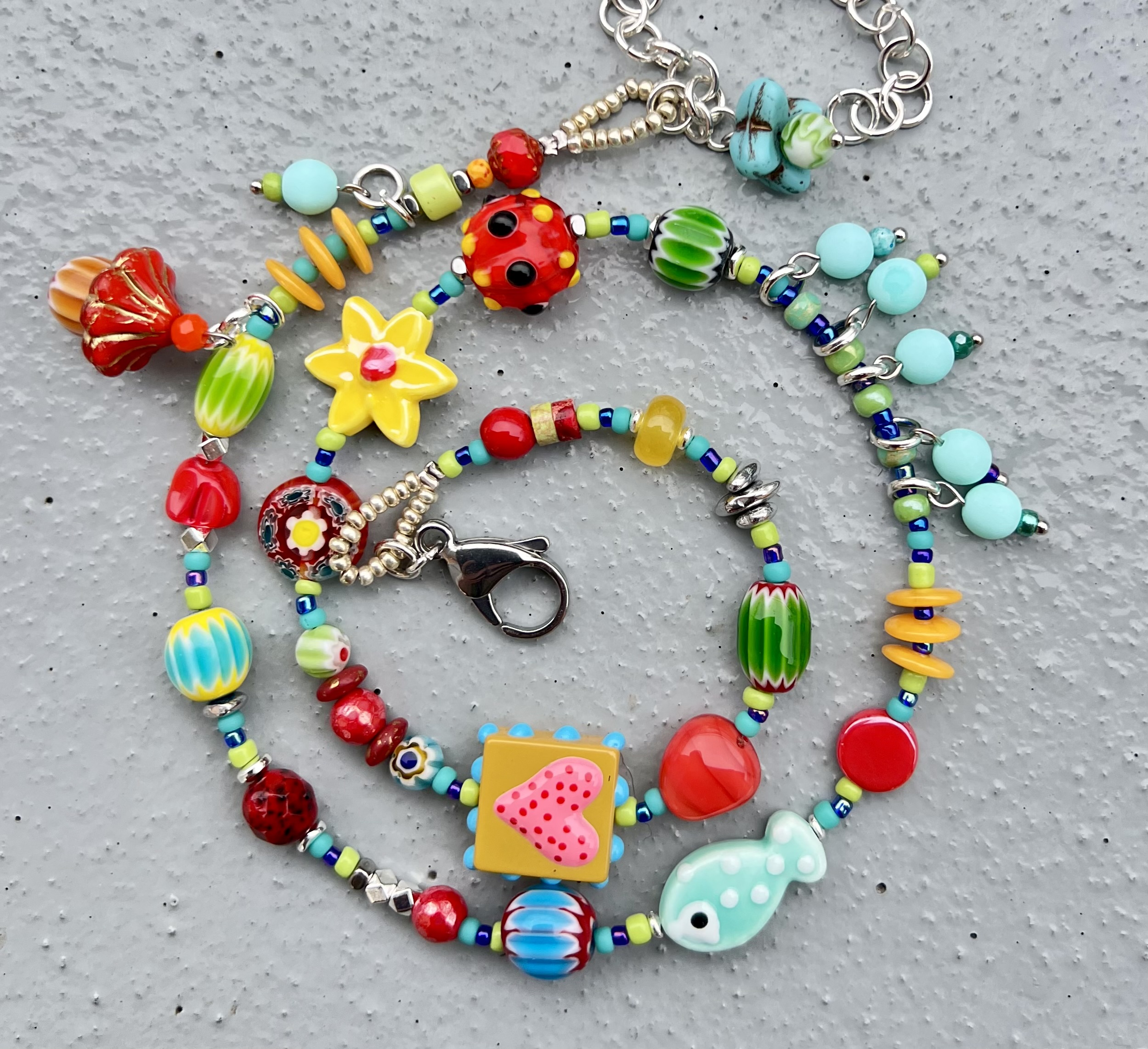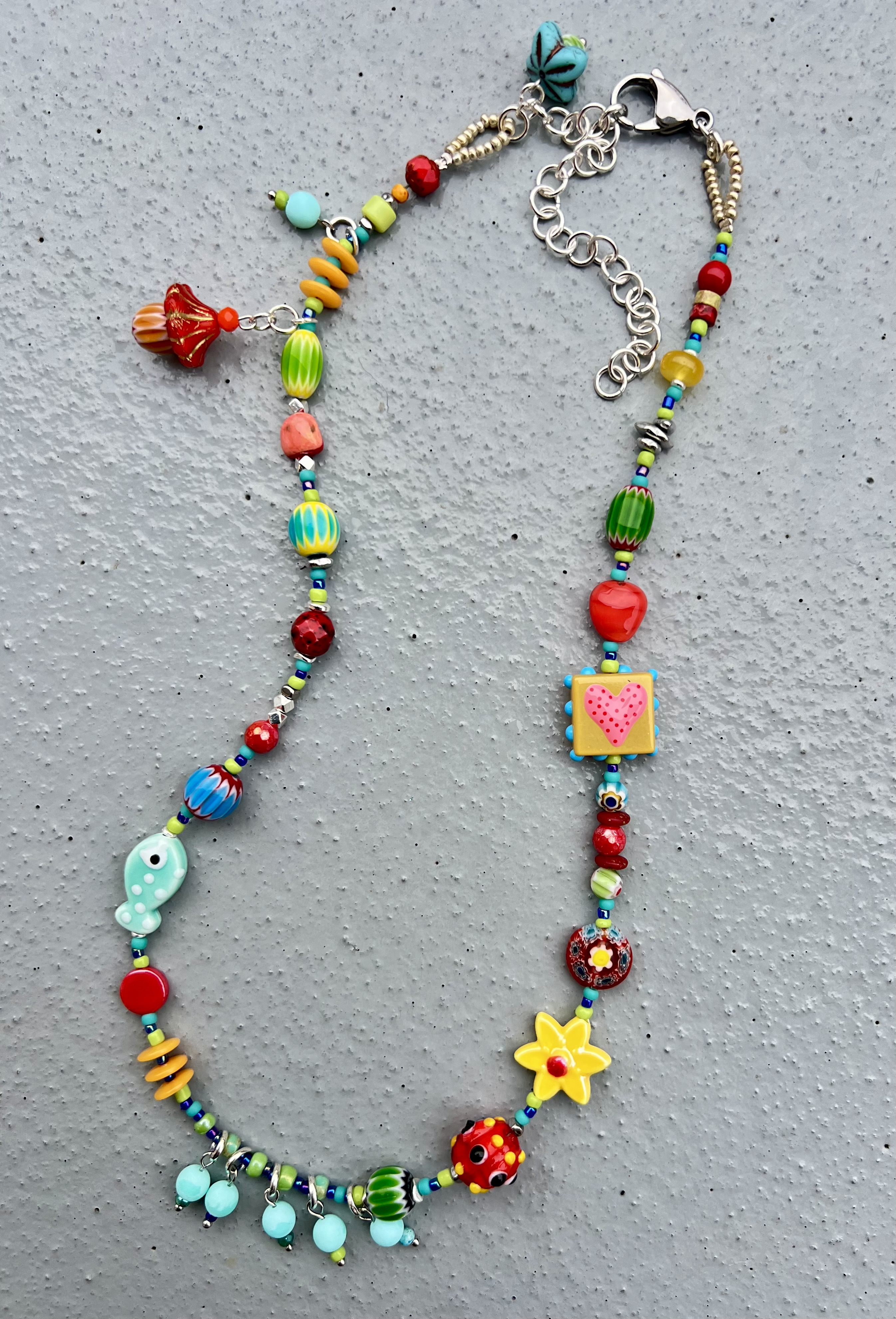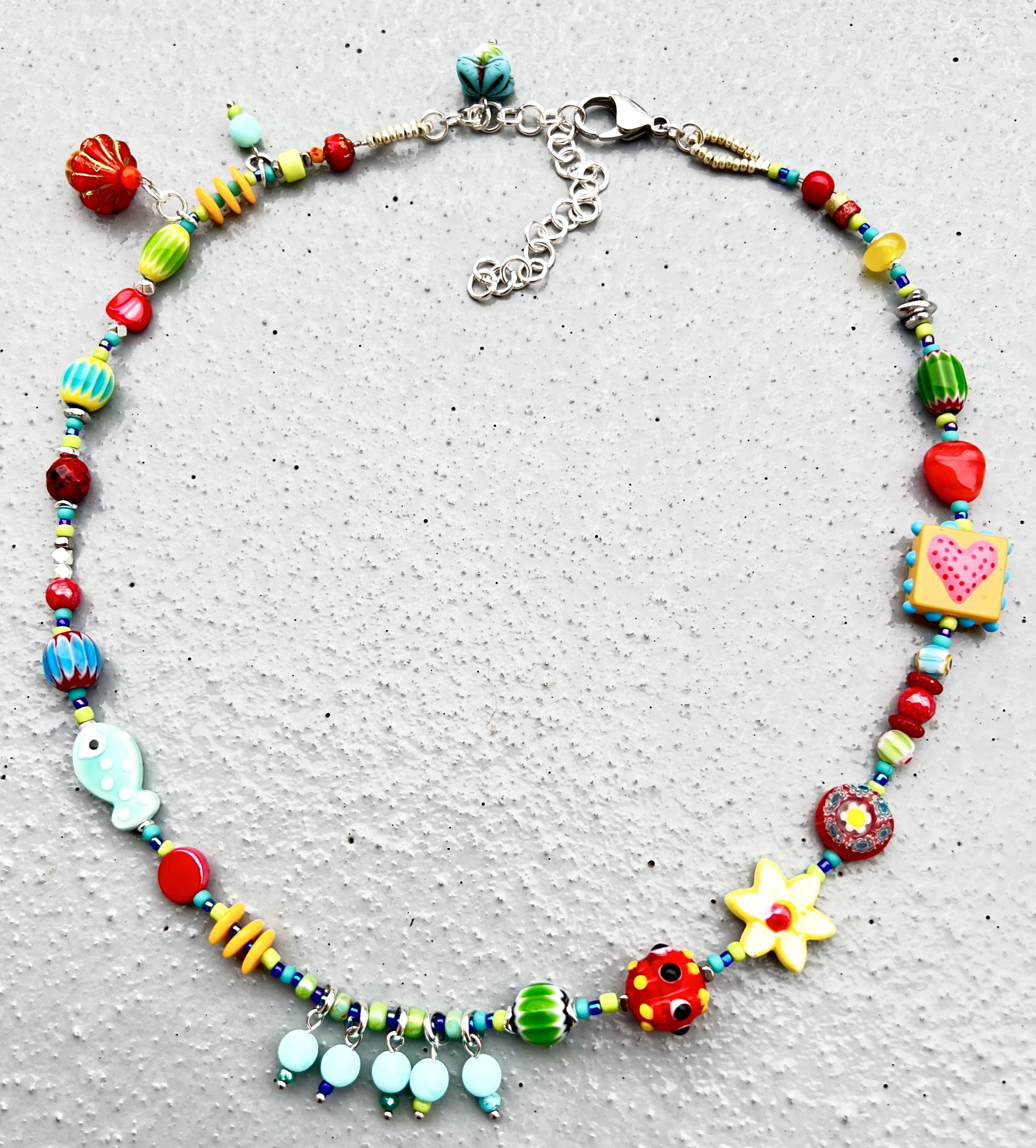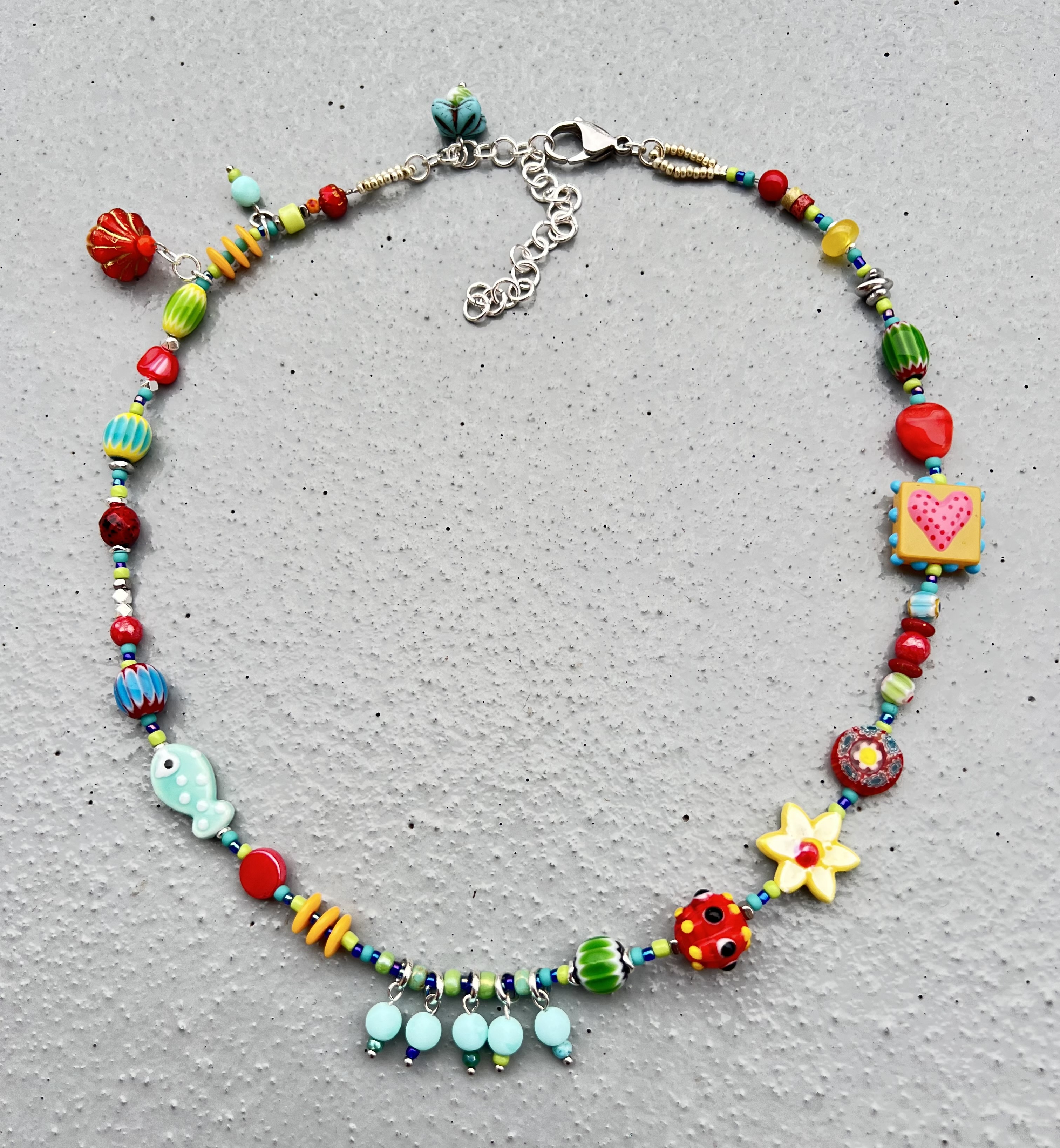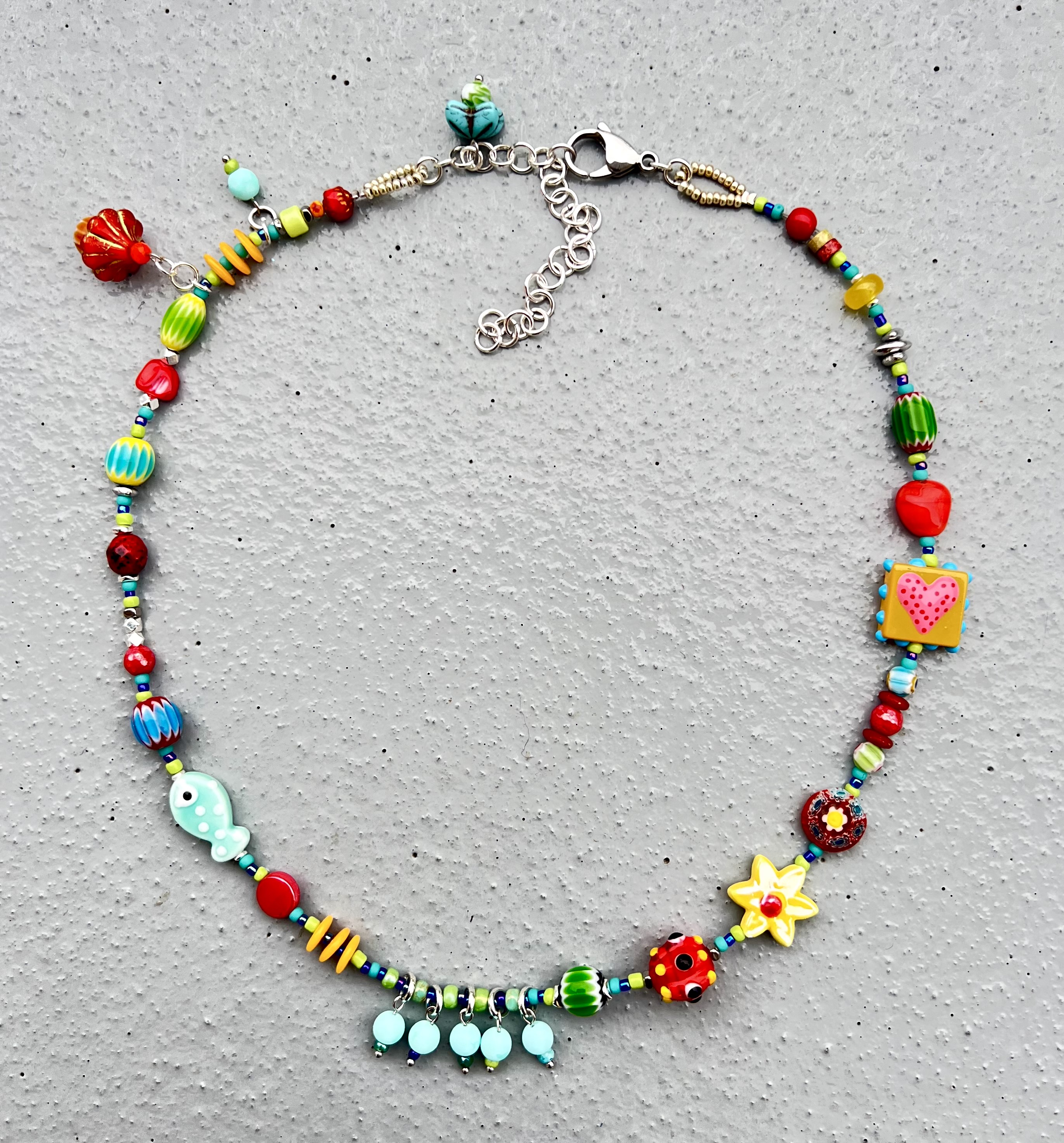 Collier Romantique Rouge, vert, écru Dentelle, rubans, perles de verre Pièce unique