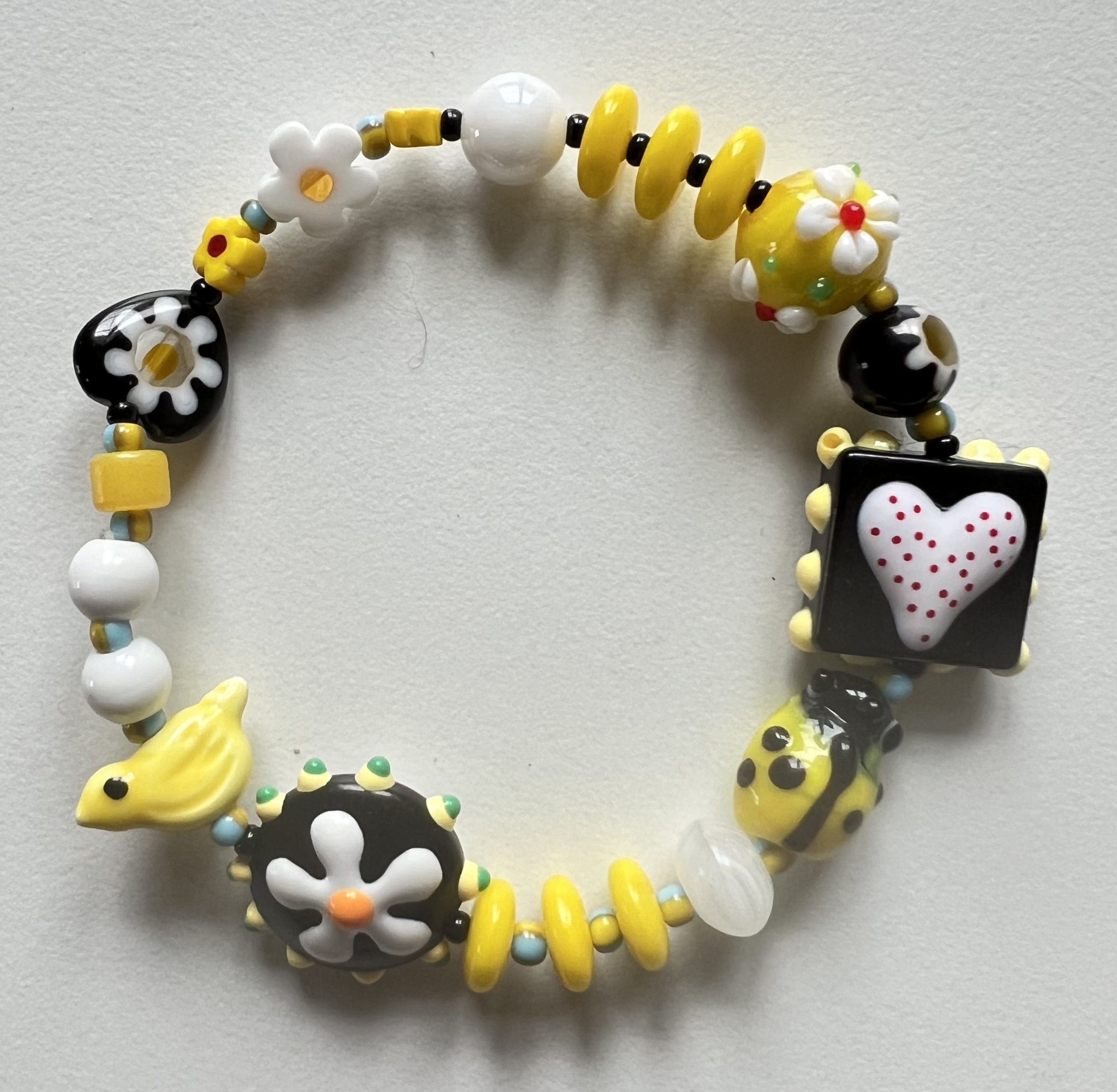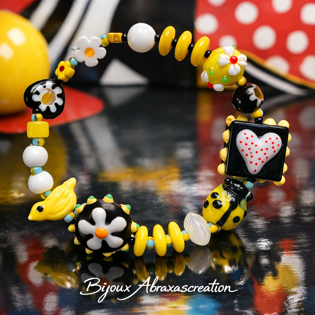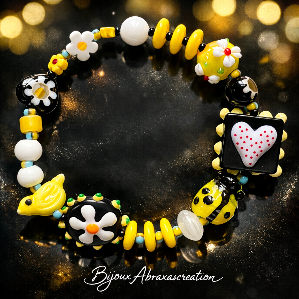 Un mélange ultra joyeux de jaune solaire, noir graphique, blanc lumineux, avec des perles rigolotes (petit oiseau, fleurs, coccinelle, cœur à pois…)