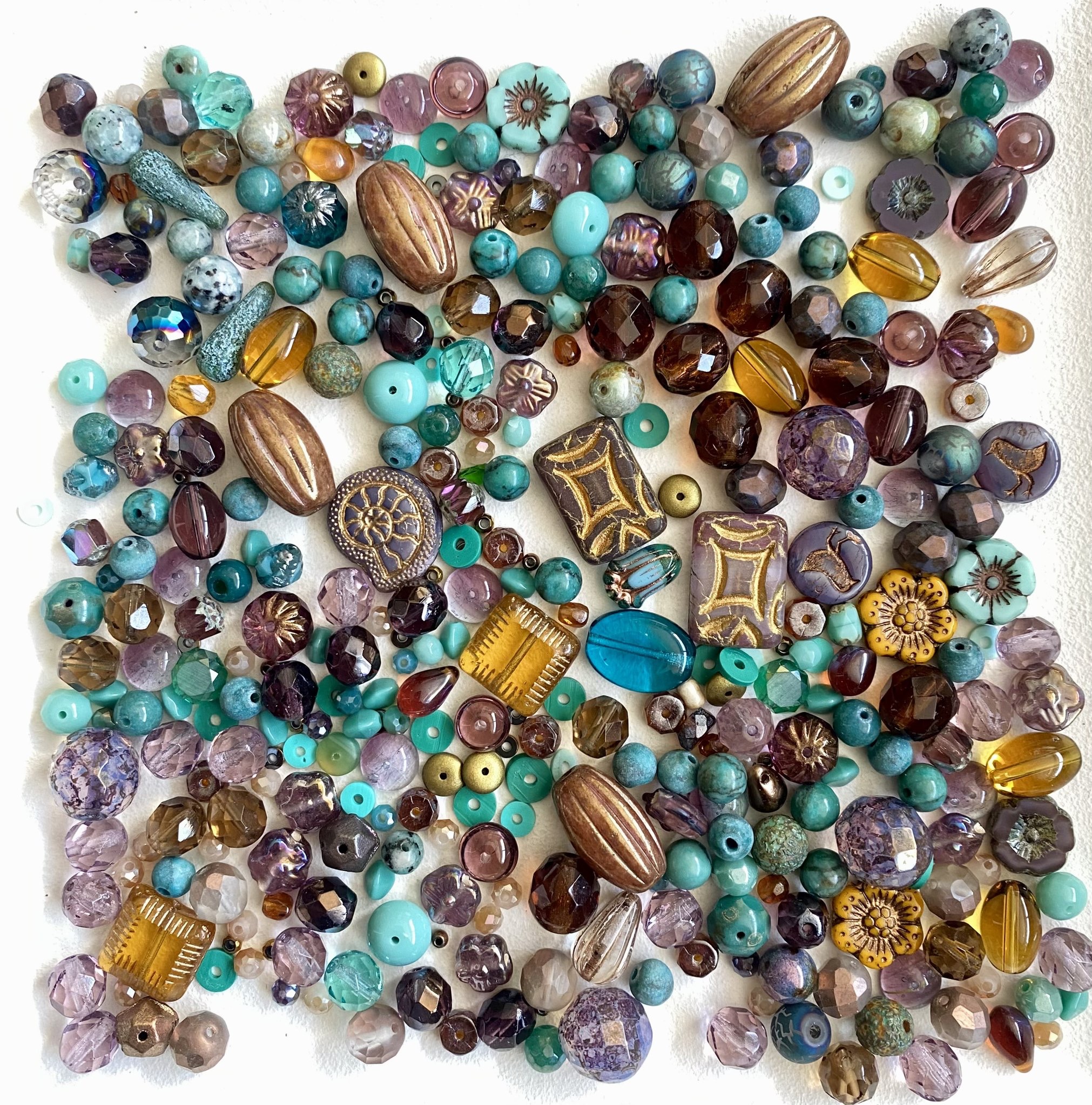 Un souffle de saison dans vos créations avec ce magnifique mélange de 300 perles de verre de Bohème & pierres naturelles. Tons turquoise, bronze, ambre, lilas et prune