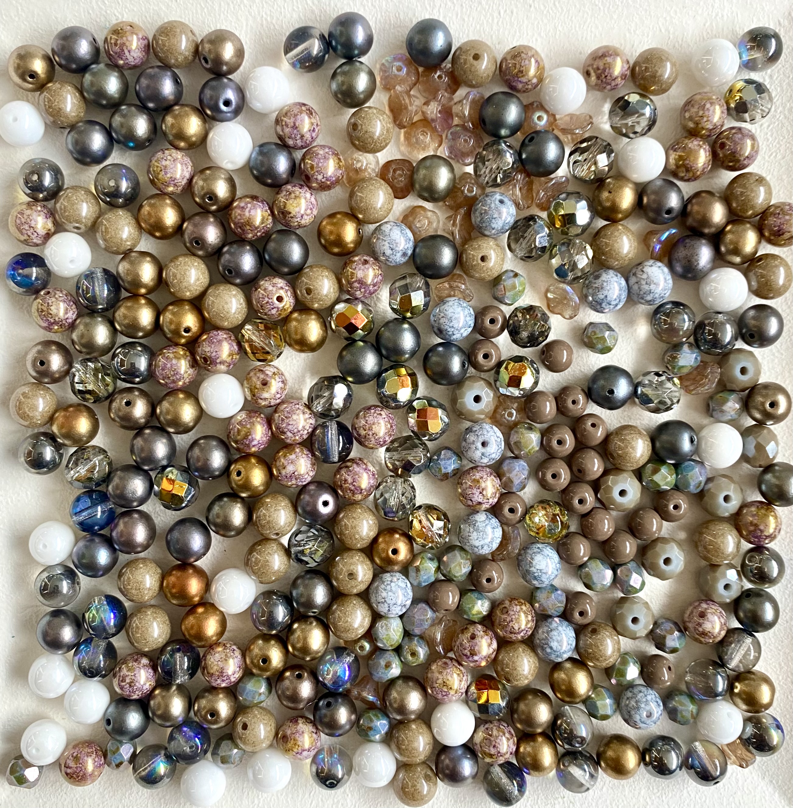 Le mélange contient plus de 300 perles en verre de Bohème (verre tchèque haut de gamme): perles effet marbre givré et sablées dorées, perles facettées scintillantes (effet lueur de bougie), perles rondes et lisses, etc.