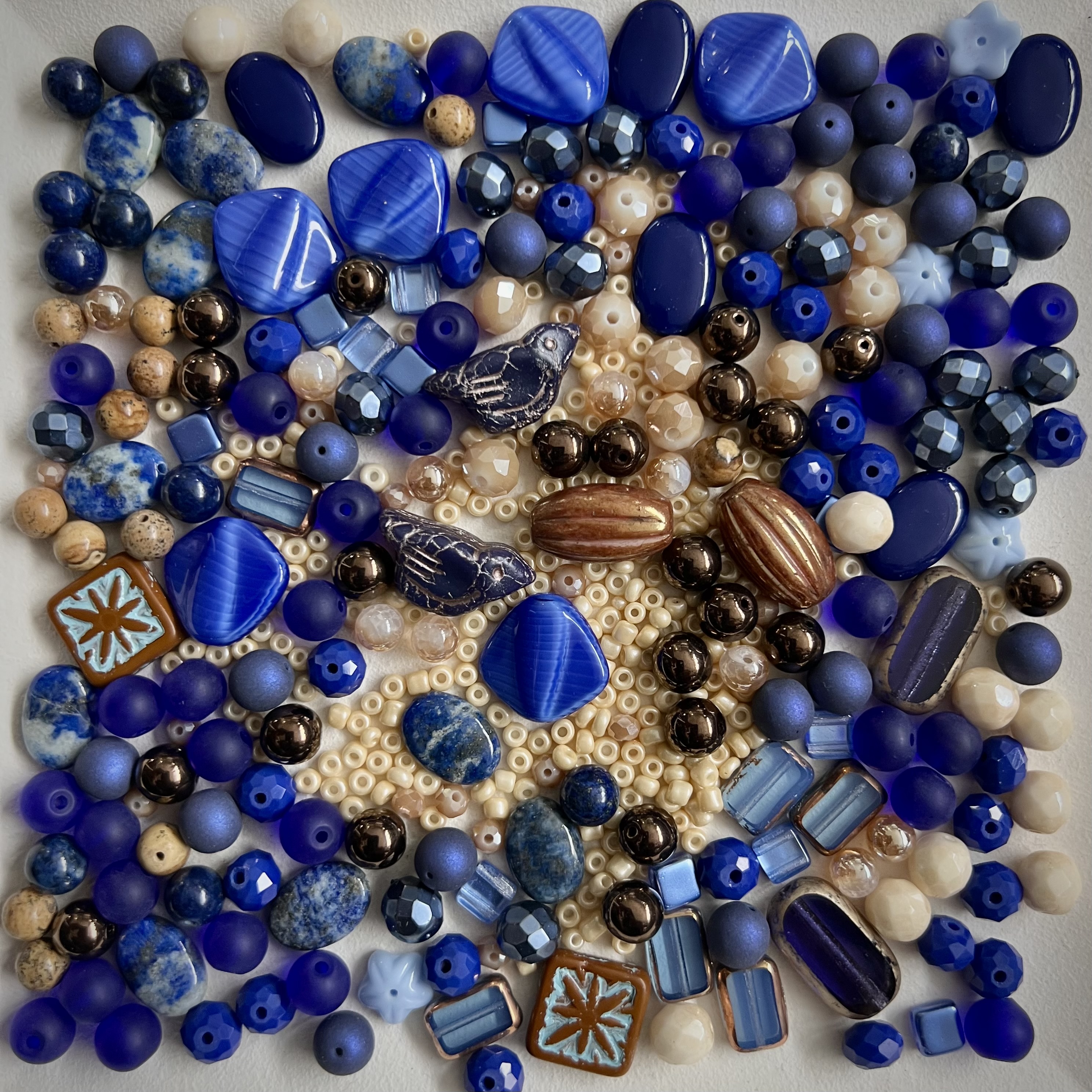 Magnifique mélange plus de 300 perles en verre de Bohème et pierre naturelle, déclinant une palette entre bleus profonds, beiges grès et reflets d’ambre, pour des créations romantiques et féeriques.